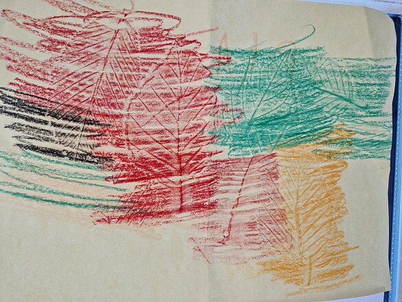 Nach der Pause haben wir die Blätter auf unserer Bastelunterlage verteilt und ein Papier darüber gelegt.